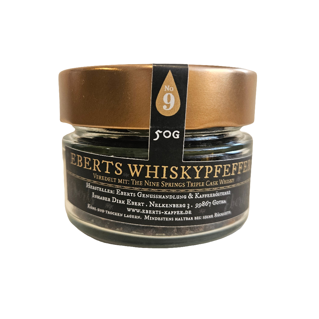 Zutaten: schwarzer Pfeffer, veredelt mit Triple Cask Whisky (The Nine Springs). Enthält <0,5% Alkohol.